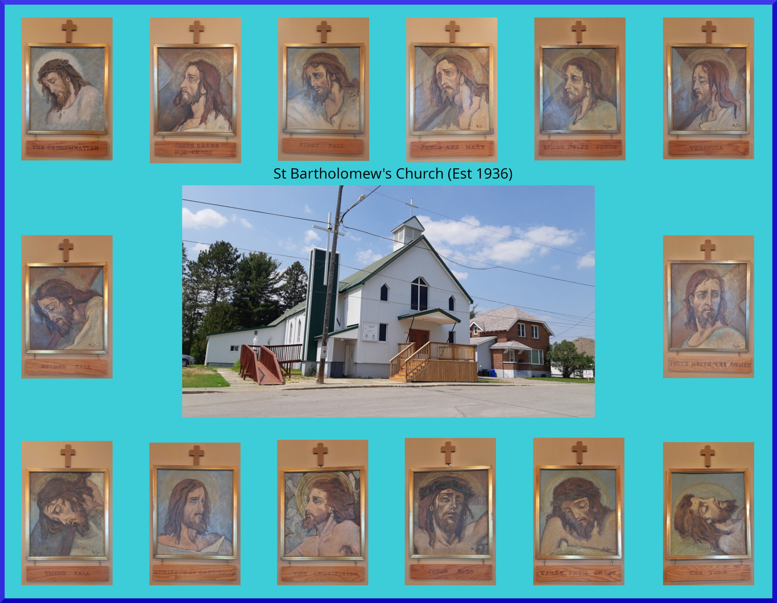 The 14 Stations of the Cross paintings at St. Bartholomew’s hung at St. Michael’s Catholic Church (1916-1986) in Creighton, Ontario until the church was closed and destroyed in 1986. After St. Michael’s closed, Father Robert Bourgon brought the Stations to Levack.