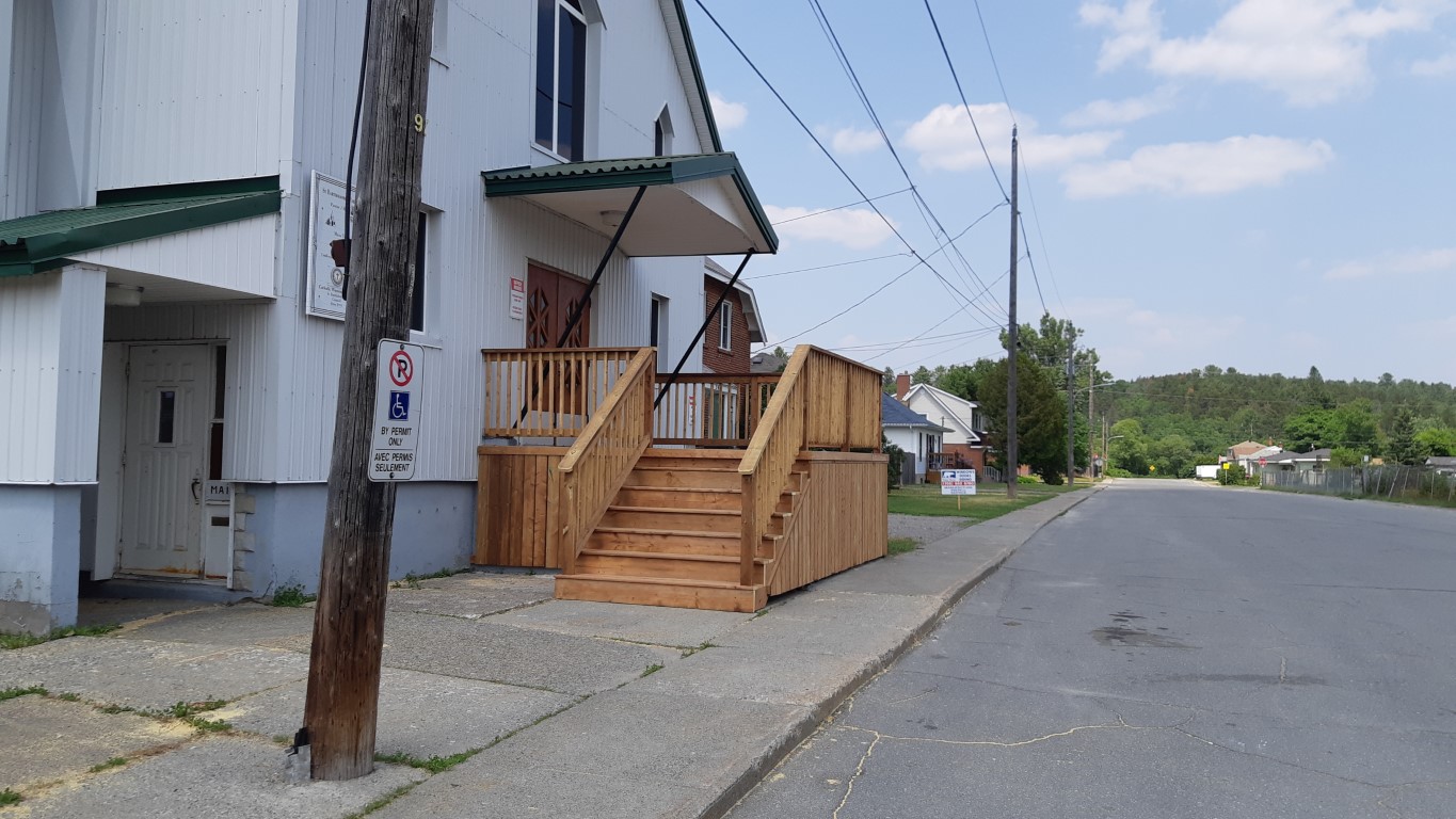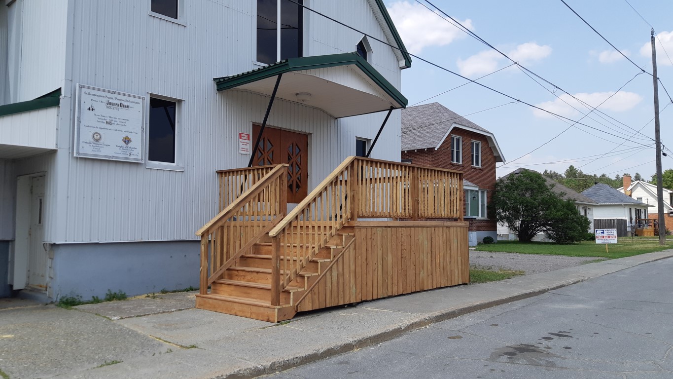 La paroisse a conclu un contrat avec Adept Construction & Landscaping Inc. de Sudbury pour modifier l’escalier actuel. Le coût total du contrat est de 14 238 $, toutes taxes comprises. L’entrepreneur est responsable de l’obtention de tous les permis de construire requis par la ville (permis de modification). Nous espérons que les travaux commenceront bientôt. Des travaux seront nécessaires sur le toit au-dessus des nouveaux escaliers pour installer des bloqueurs de glace afin d’empêcher la glace de tomber du toit, mais ces travaux seront effectués à l’automne prochain.